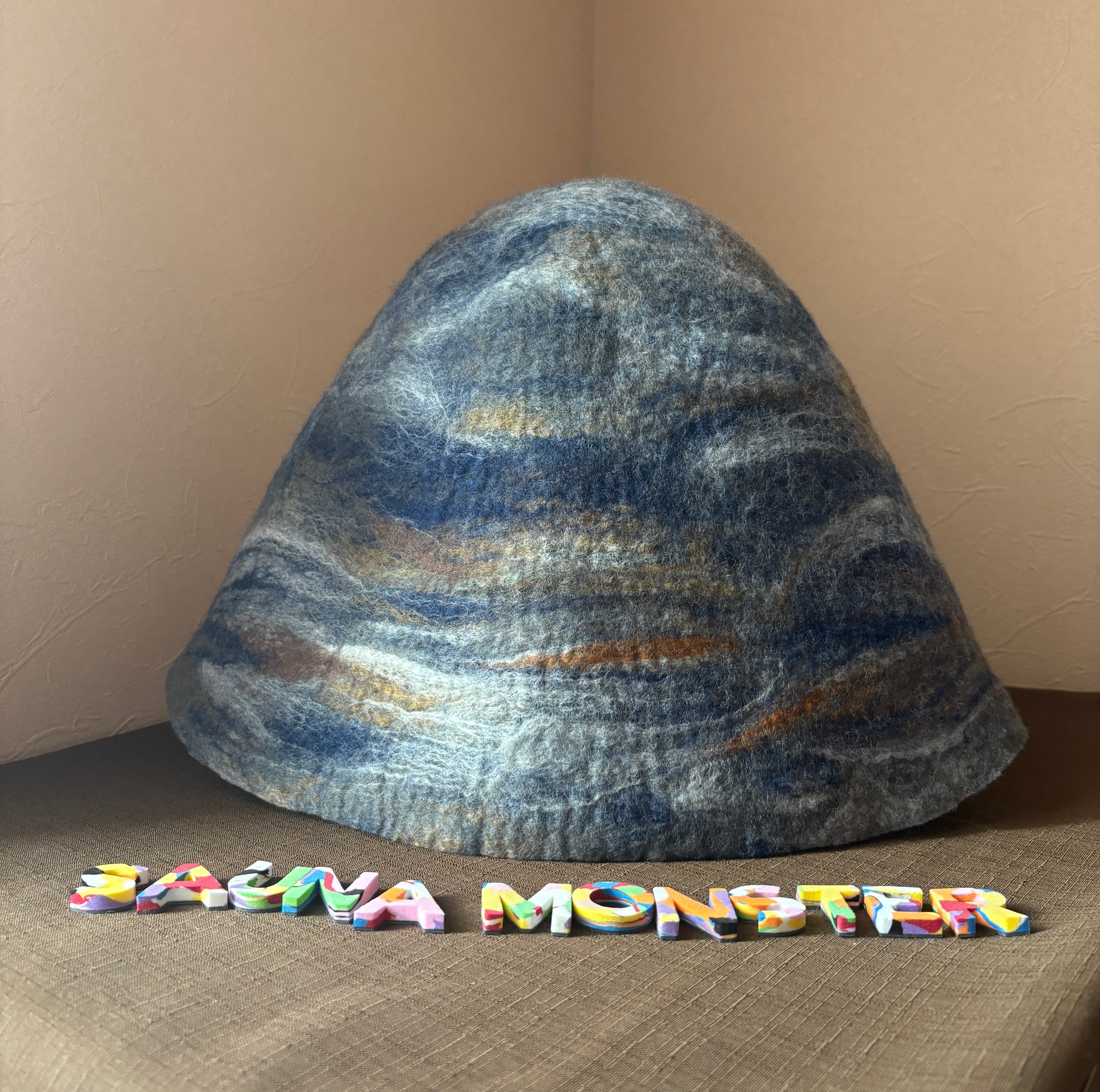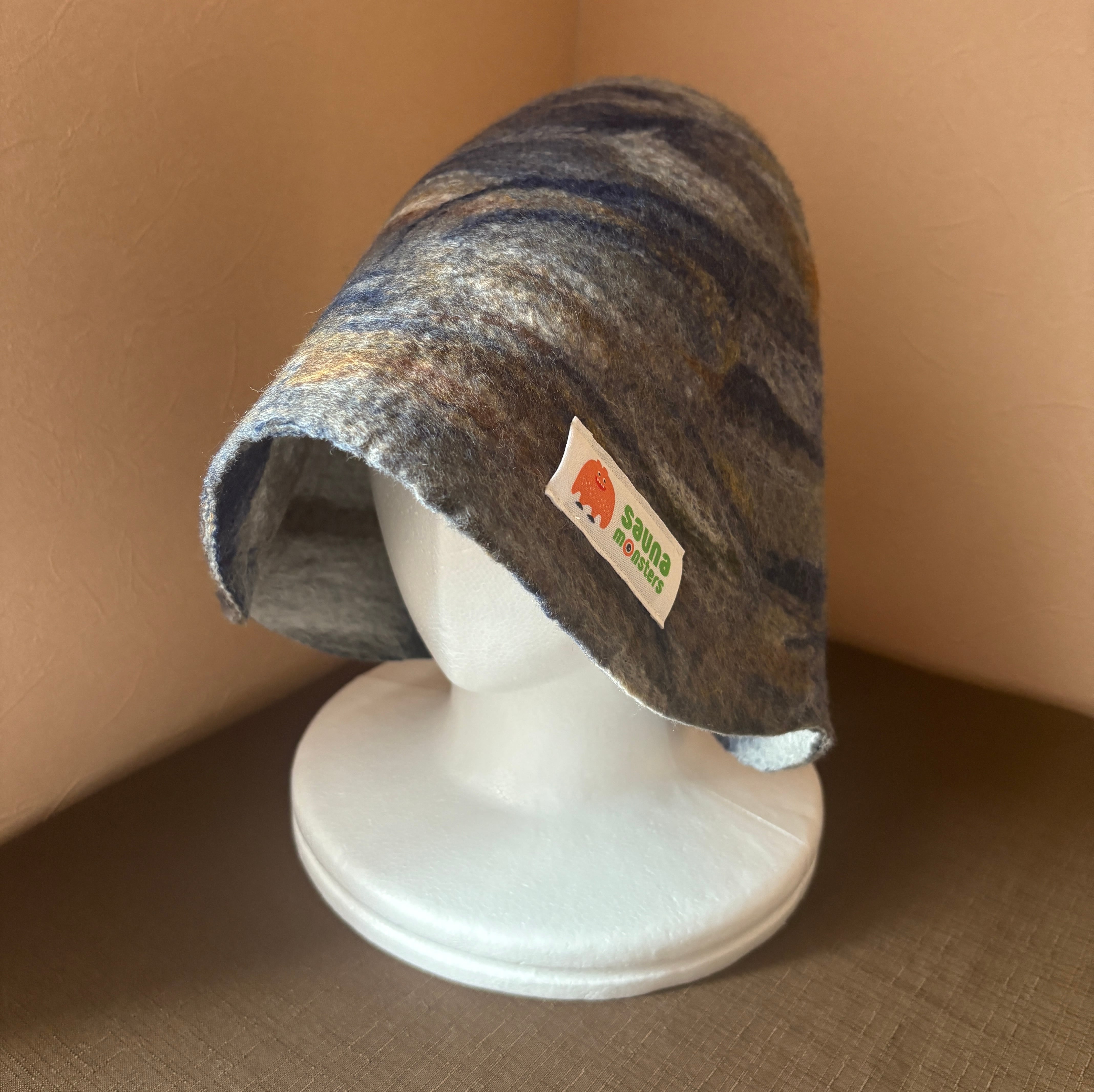 濃いブルーがメインにブラウンなどアース色をミックスしたカラーです。自分だけのオリジナルサウナハットになります。シンプルな形なので被りやすいデザイン。