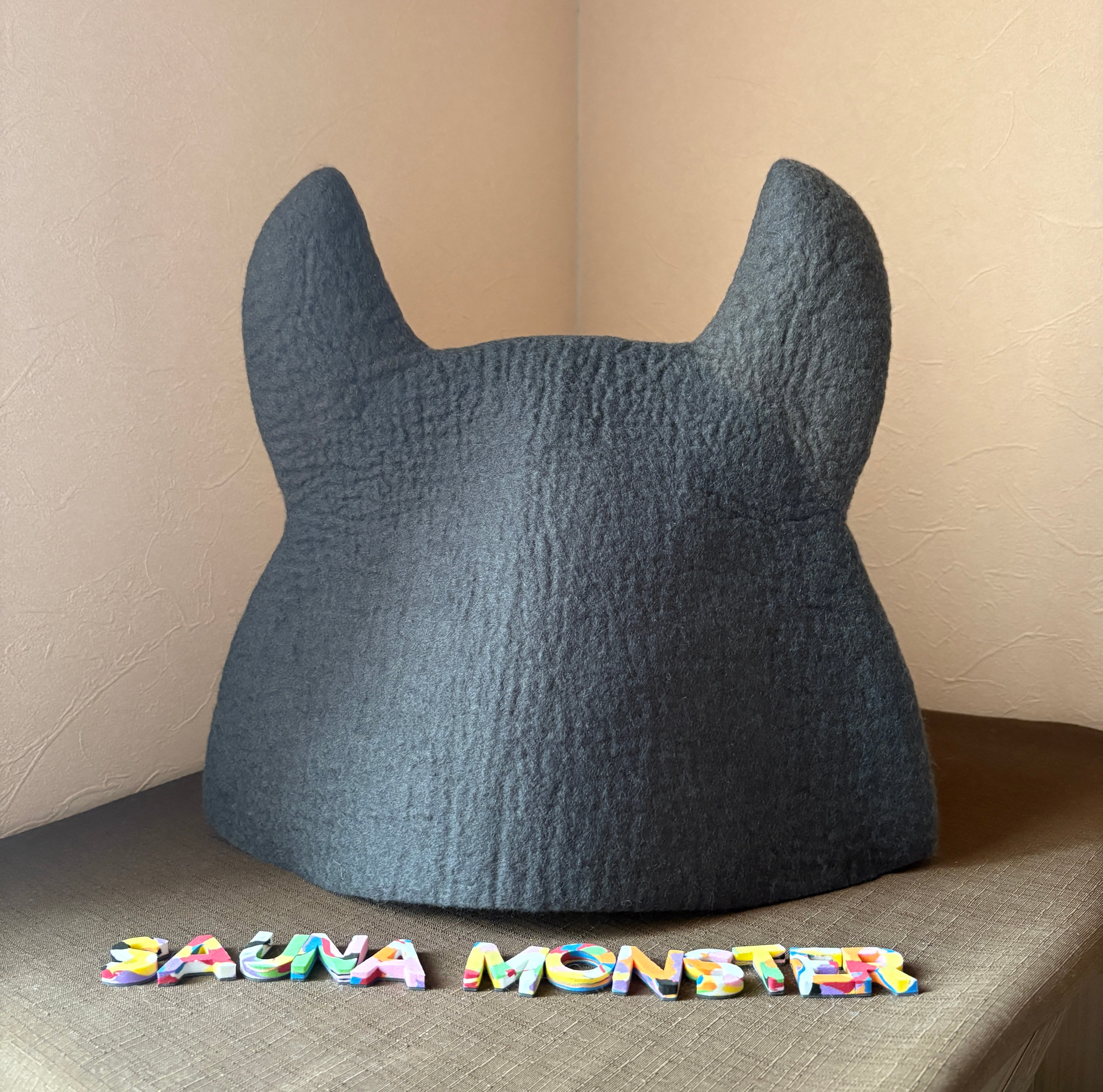 ツノがダークブラウン、本体がダークグレーでシックな色合い。落ち着いた雰囲気のサウナハットです。